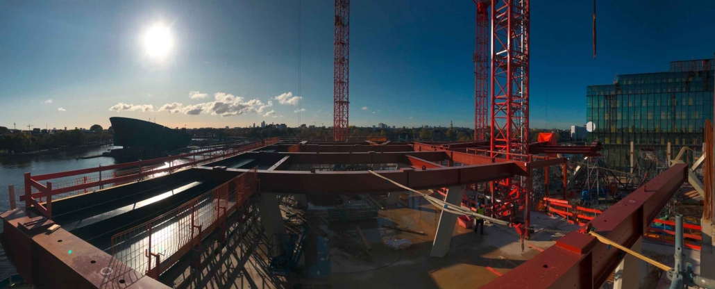 La concrétisation de cette vision est possible grâce à un concept de structure porteuse complexe qui combine des constructions métalliques et des constructions en acier-béton dans un grand nombre de détails individuels afin de pouvoir ainsi bénéficier de leurs atouts respectifs.