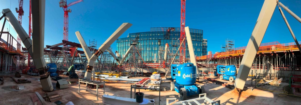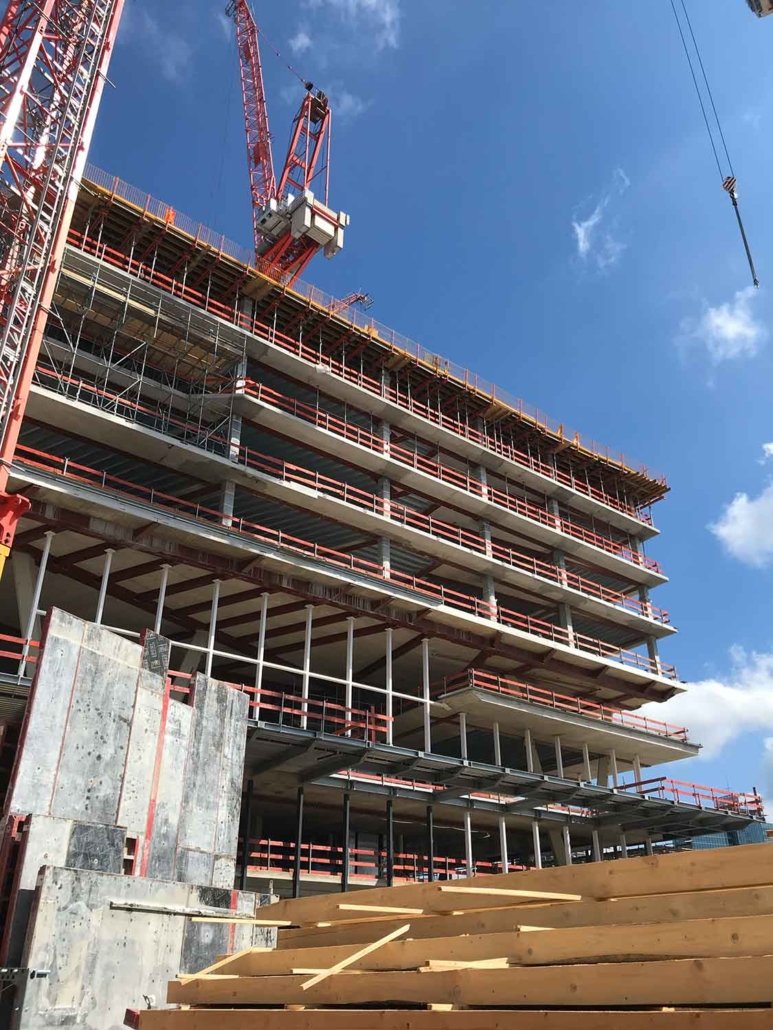 La vision d’espaces spacieux est réalisable grâce à des constructions comme les poteaux en acier qui enjambent ces espaces et les ouvrent sur une hauteur de 4 étages maximum. L’ensemble du complexe d’appartements repose sur des colonnes en acier en forme de Y totalement enrobées de béton afin de créer en dessous de l’espace pour des commerces de restauration. Pour exploiter la géométrie du terrain de manière optimale, une partie du bâtiment a dû être construite en porte-à-faux sur 25 m. Grâce à des solutions innovantes et à une collaboration constructive (et à des colonnes dont le poids propre peut atteindre jusqu’à 100 tonnes), cette vision a pu devenir réalité.